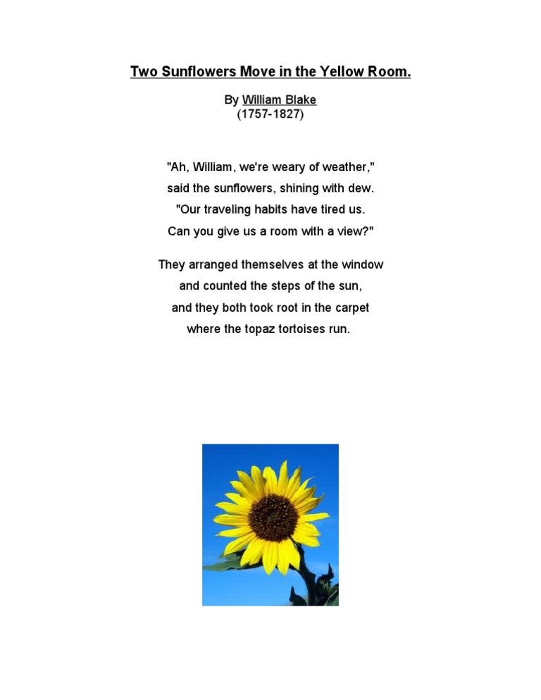 The sunflowers are tired of being outside traveling all the time and they want to have a more stable. Two Sunflowers Move in the Yellow Room William Blake. I think this poem is first and foremost personifying nature specifically sunflowers.